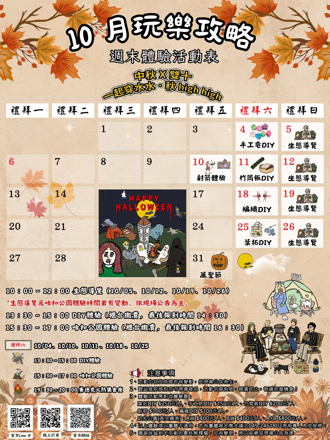 13:30 - 15:00| 生態導覽|竹筒飯DIY 🎋|葉拓DIY| 射箭體驗🏹|溫泉皂DIY🧼 (每週輪流安排)